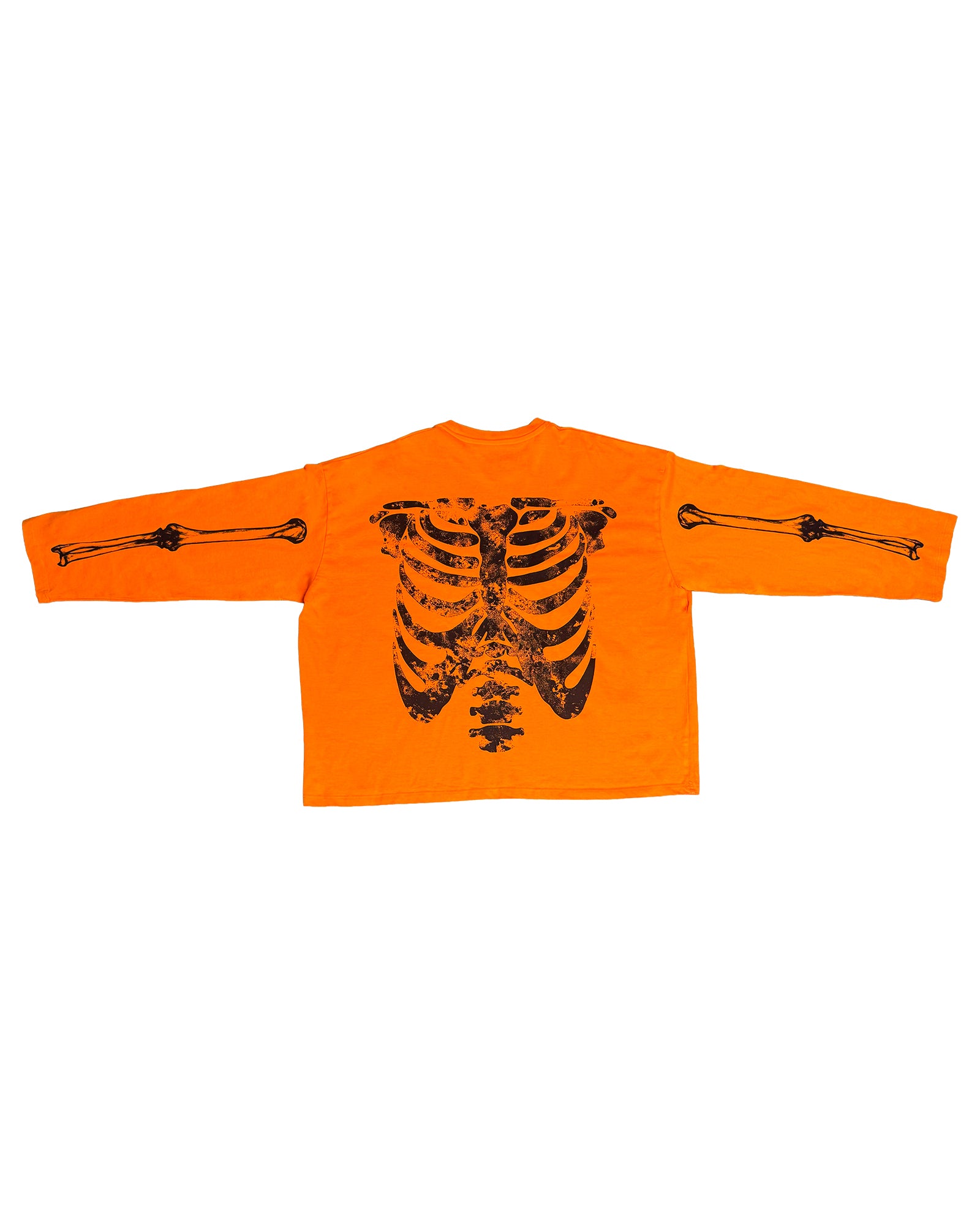 T-shirt maniche lunghe arancione con stampa scheletro fronte retro